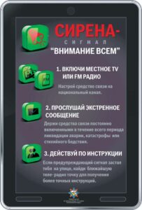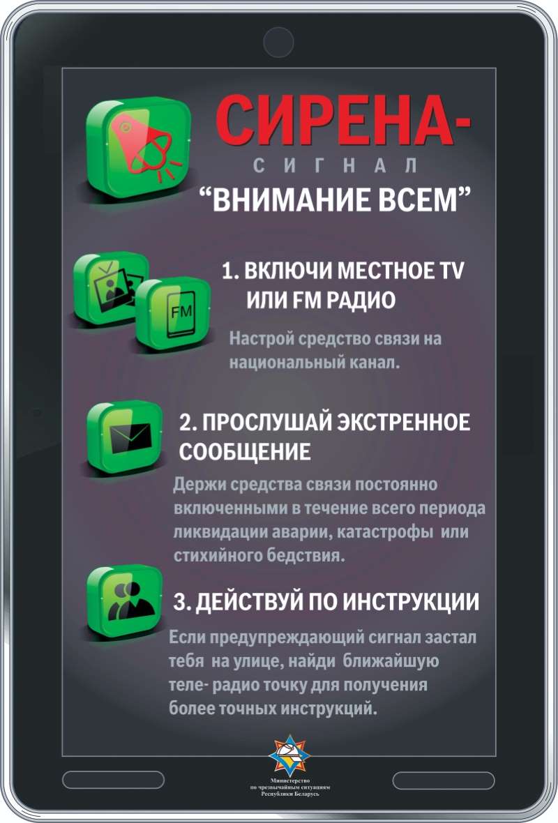 МЧС напоминает: при сигнале гражданской бороны «Внимание всем!», который представляет собой звук сирены, необходимо включить любое средство массовой информации – радио, телевидение и прослушать информацию, действовать согласно полученным инструкциям. Обращайте внимание на сообщения, рассылаемые МЧС на мобильные телефоны.