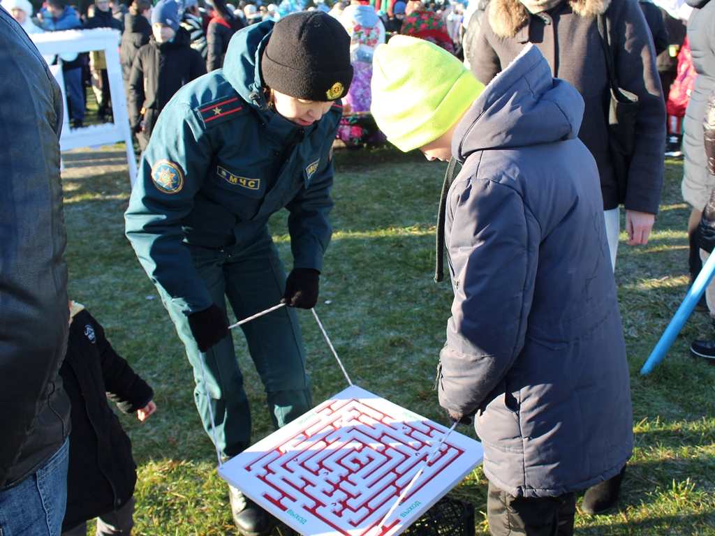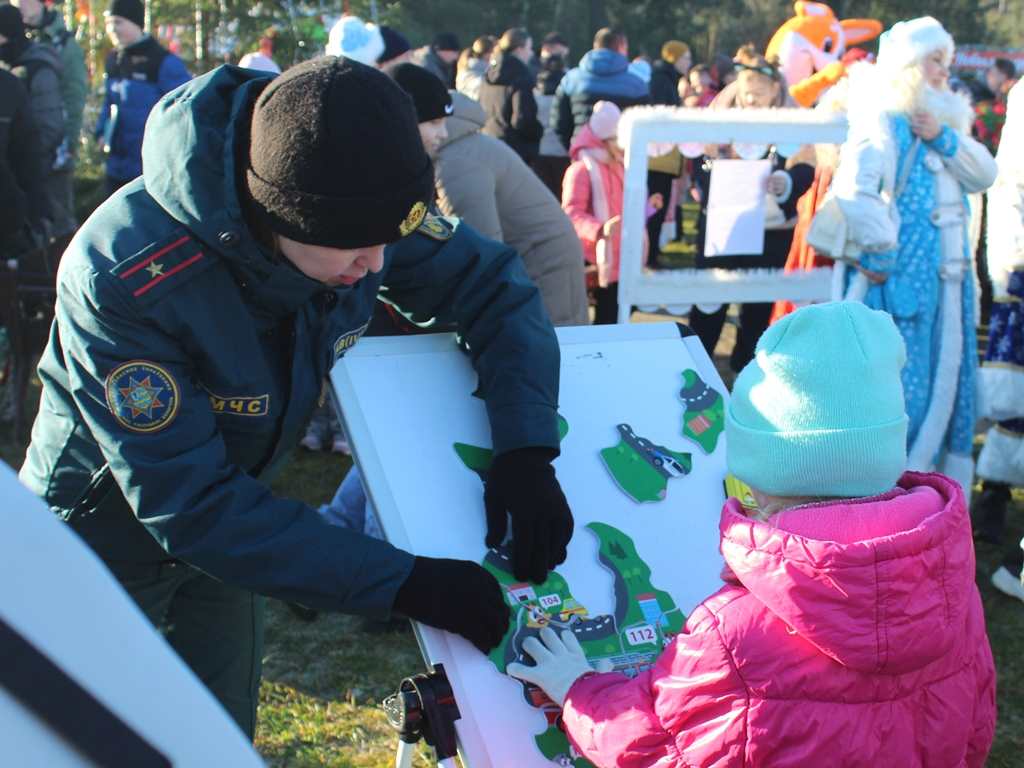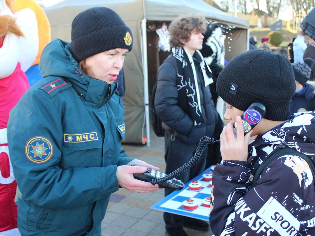 Масштабные мероприятия прошли на центральной площади города Березино и в зоне отдыха у городского озера. Шествие Дедов Морозов и Снегурочек, конкурсы и забавы, викторины и интерактивы приготовили для детей множество организаций района. Спасатели предложили людям уже полюбившиеся игры «Шашки безопасности», «Эвакуация», «Страна безопасности», викторину и розыгрыш призов. За участие можно было выиграть кружку МЧС, фликер, рюкзак, полезную наглядную продукцию. Трудно переоценить роль юных спасателей из клуба «Сирена»: они вовсю трудились, рассказывая людям об опасностях использования пиротехники, предостерегали от выхода на тонкий лед водоёмов, вручали памятки и буклеты. Люди с удовольствием фотографировались с ростовыми куклами – на празднике эти персонажи определенно имели успех у юных гостей праздника.