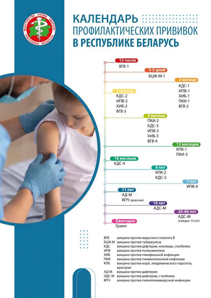 Вакцинация населения против инфекций, управляемых и предупреждаемых средствами специфической профилактики, ведется в рамках Национального календаря профилактических прививок и перечня профилактических прививок по эпидемическим показаниям. Данный перечень установлен постановлением Министерства здравоохранения Республики Беларусь от 17 мая 2018 г. № 42 «О профилактических прививках».