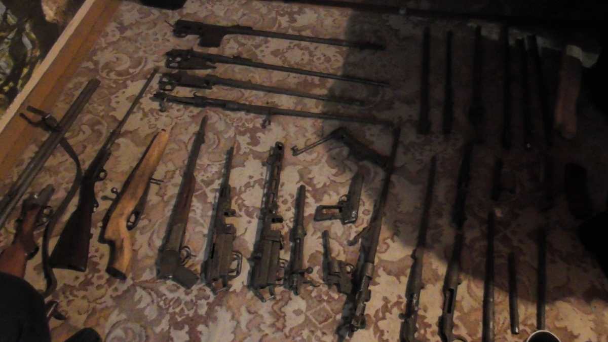 Кроме того, при проведении осмотра, в жилом доме гр-на «П» сотрудниками Березинской МРИ было обнаружено незарегистрированное огнестрельное нарезное оружие и боеприпасы к нему. На место происшествия вызваны СОГ Березинского РОВД и Березинского РОСК. В ходе дальнейшего осмотра обнаружены и изъяты: 6 единиц незарегистрированного огнестрельного оружия, из которых: 5 — нарезного, 1 — гладкоствольного охотничьего; более 1700 шт. патронов к нарезному оружию различных калибров; более 30 патронов к гладкоствольному охотничьему оружию 12 калибра; около 2,5 кг. пороха; 14 взрывных устройств (взрыватели, детонаторы, запалы); 49 составных частей к огнестрельному нарезному оружию, различные приспособления для разбора, ремонта, восстановления оружия; психотропные вещества.