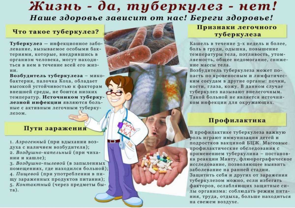 Как помочь больному, как дезинфицировать его вещи, делать уборку в помещении, обрабатывать мокроту – об этом расскажут в туберкулезном диспансере. Вся семья больного должна наблюдаться в диспансере по контакту, вовремя обследоваться и проходить профилактические курсы лечения в соответствии с рекомендациями фтизиатра.