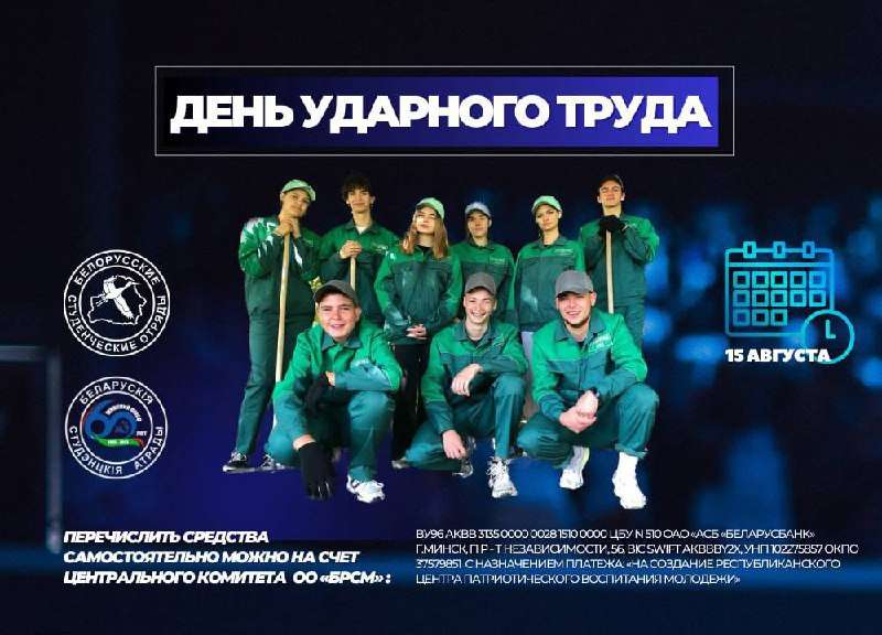 Минский областной штаб студенческих отрядов объявляет о проведении молодежной трудовой акции «День ударного труда» 15 августа 2023 года на территории Минской области