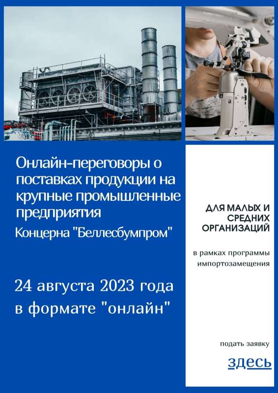 24 августа 2023 года с 10:00 до 12:00 часов в рамках контактно – кооперационной биржи планируется проведение онлайн-переговоров с ОАО «Слонимский картонно-бумажный завод «Альбертин», ОАО «Управляющая компания холдинга «Белорусские обои», филиал «Добрушская бумажная фабрика «Герой труда», РУП «Завод газетной бумаги», ОАО «Бумажная фабрика «Спартак», ОАО «Светлогорский ЦКК», ОАО «Борисовский ДОК», ОАО «Ивацевичдрев» – управляющая компания деревообрабатывающего холдинга «BYSPAN», подведомственными концерну «Беллесбумпром» Республики Беларусь. Срок приема заявок: до 23 августа 2023 года.