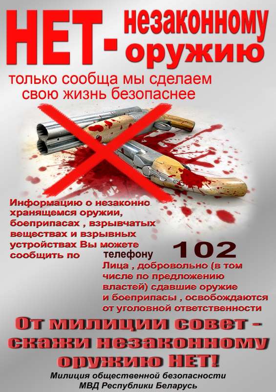 О желании добровольно сдать, а также фактах незаконного хранения оружия, боеприпасов, взрывчатых веществ и взрывных устройств Вы можете сообщить по телефону горячей линии 8 029 7441160 (МТС) либо 8 01715 48632 либо телефону 102