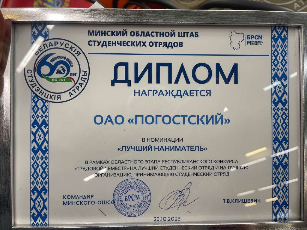 В рамках закрытия третьего трудового семестра состоялась церемония награждения. В рамках нее лучшим нанимателем студенческого отряда стал ОАО «Погостский» Березинского района.