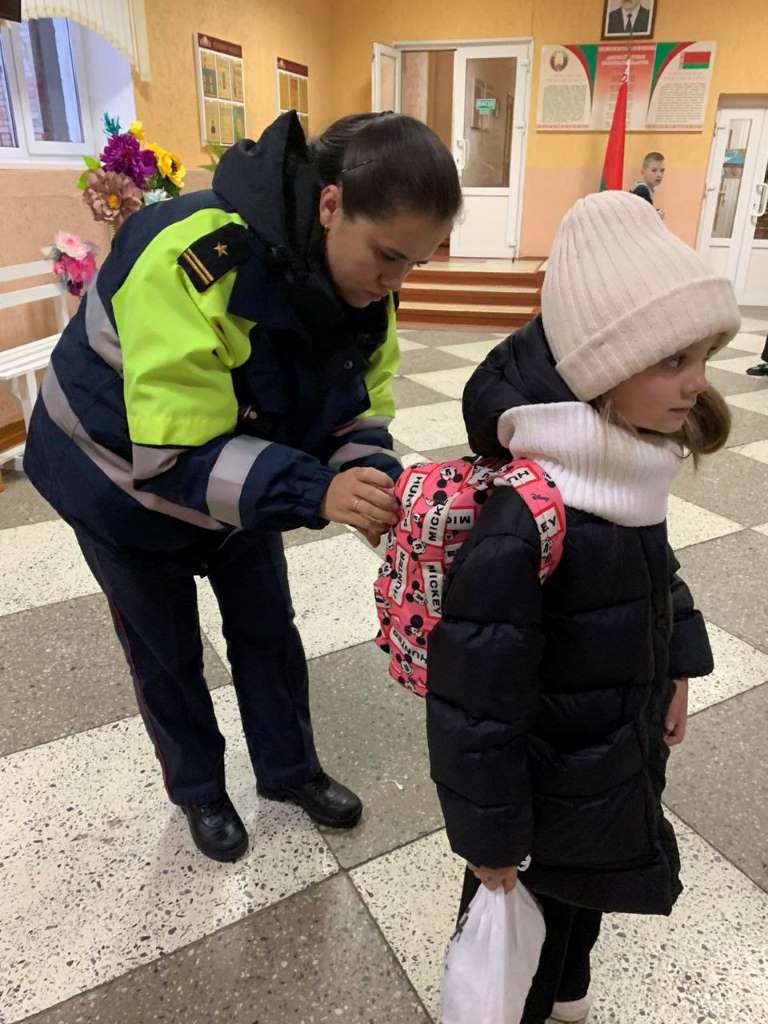 25 октября 2023 года в рамках республиканской профилактической акции «Не будь невидимкой на дороге!» Старший инспектор по АП ОГАИ Березинского РОВД майор милиции Камеко Юлия Владимировна проверка рейд по проверке у учащихся начальных классов в ГУО «Березинская гимназия» световозвращающих элементов.