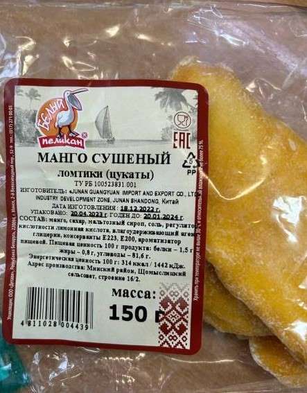 Манго сушеный ломтики (цукаты), массой 150 гр., ш/к 4811028004439.